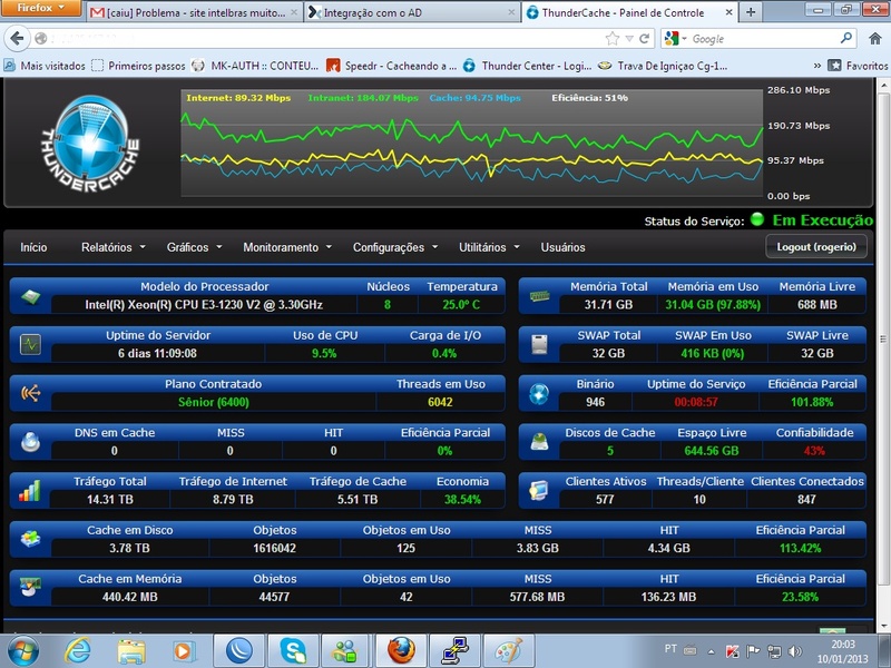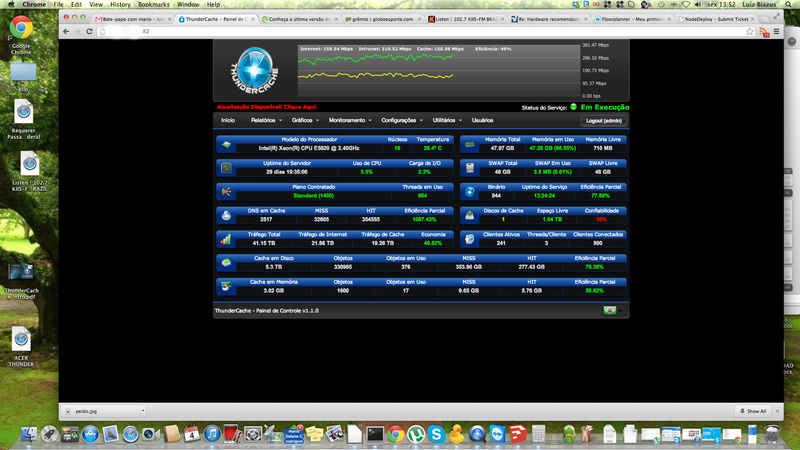 Usei o thunder por algum período não sei se por hardware tive alguns ou muitos problemas não to culpado o thunder... esse mesmo pc deu pau e eu fiquei sem cache por um bom periodo, agora montei um serve aqui: Placa Intel S3420GPLX, Xeon 3430, 12GB DDR3 (chegando mais 4gb) 1SSD 120GB (Sistema) 4HD sata para cache.... nesse momento estou usando o SuperCache, me concederam uma licença para teste, ja tem mais de semana rodando e sem problemas... Thunder x SuperCache o que me dizem?
