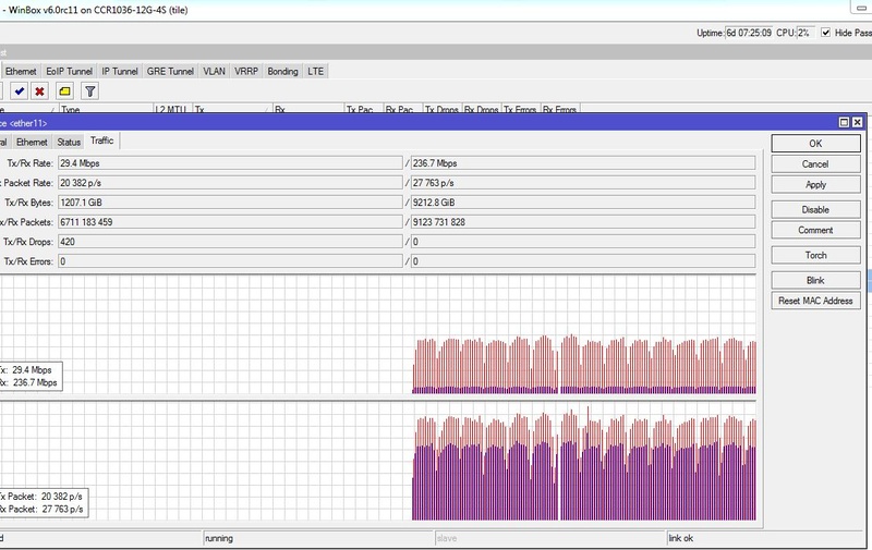 Senhores esse equipamento fecha bgp com 300mb operadora, link em todas interfaces fica oscilando pra baixo conforme mostra imagem em anexo, equipamento me parece instavel, tatencia dela tambem esta muito estranha. porem processamento baixo... 5% max...