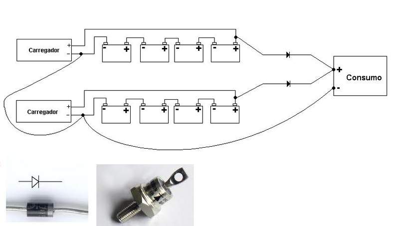 Não tem como colocar um diodo entre as baterias e o controlador de carga (Pra usar 2 conjuntos de baterias num controlador só) porque o controlador precisa medir a tensão das baterias, teria como fazer um sisteminha com rele (Rele alimentado pela rede eletrica, ao acabar a eletricidade o rele desarma a "união" entre os 2 positivos dos 2 conjuntos, precisaria um rele e 2 diodos), mas acho melhor ter 2 conjuntos desse até a título de precaução, por aqui os controladores de carga queimam muito por raio, temos que ter sobressalentes igual.