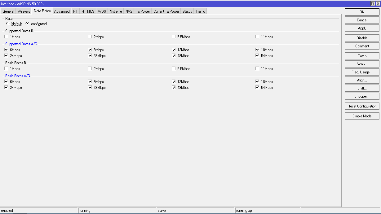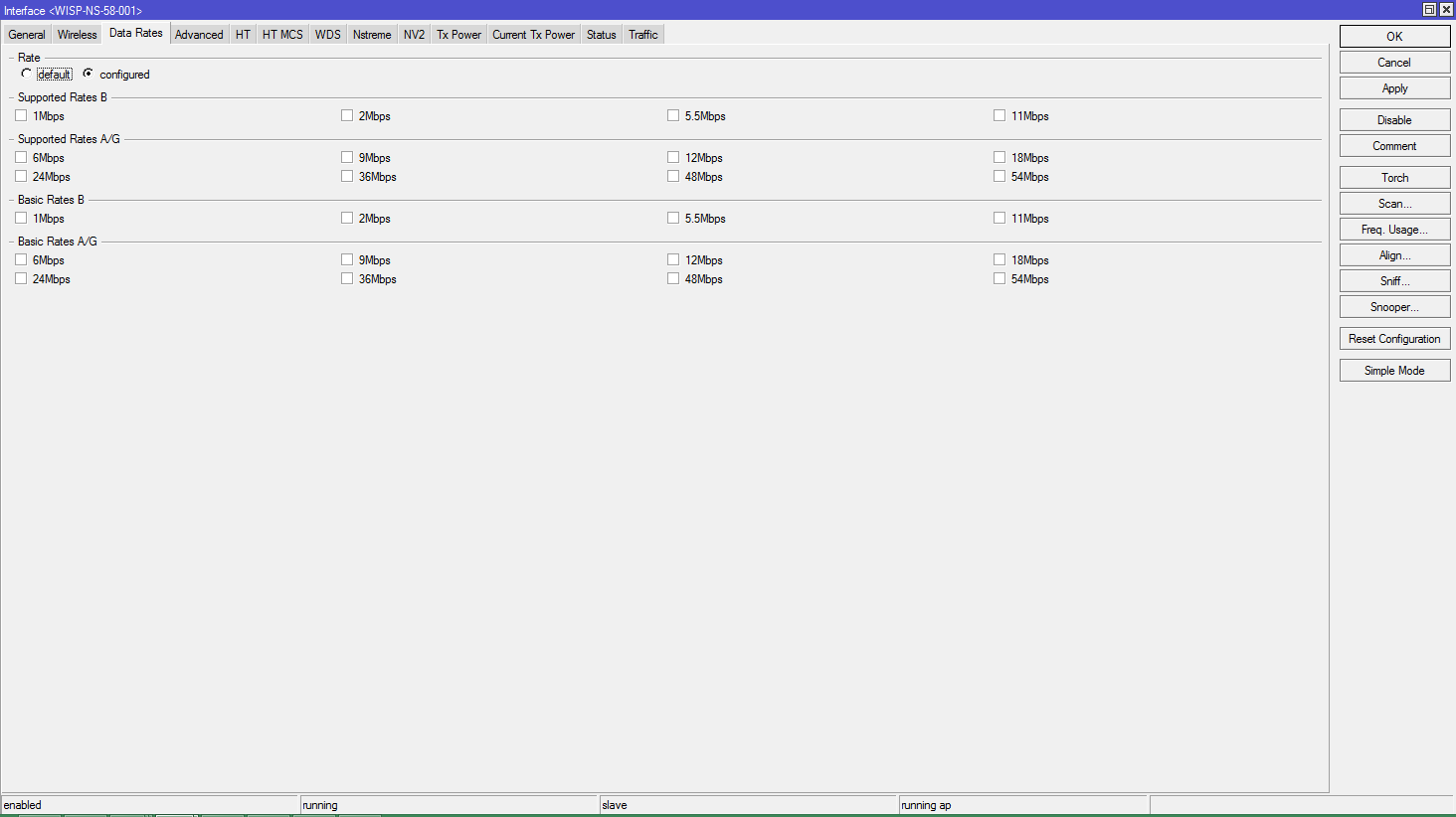 Para ativar/desativar determinados MCS, somente consigo colocando o Data Rates e Configured, caso fique em Default não consigo depois manusear os MCS.