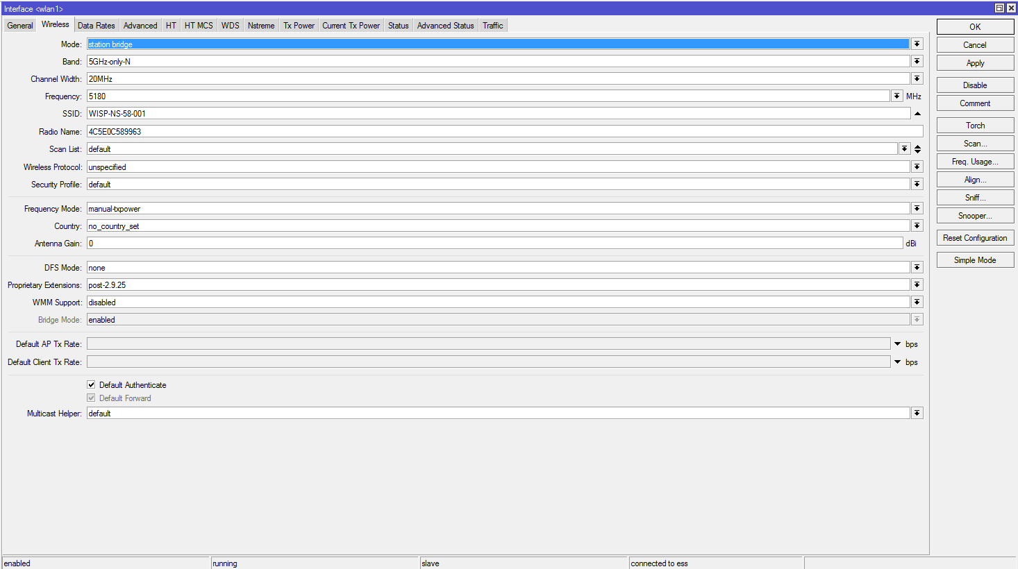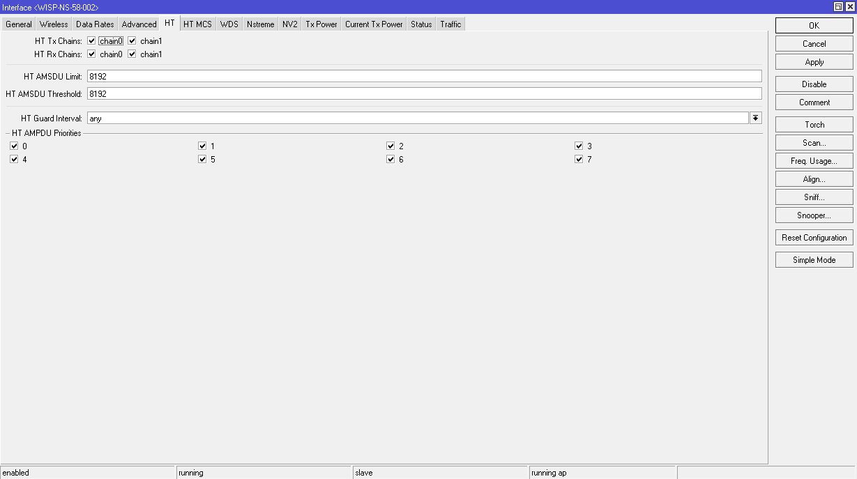 Testa na torre o HT guard interval em long, o datarate fica menor mas acho talvez MK tenha melhor desempenho com ele já que NV2 usa isso (O TX rate vai cair de 86M pra 78M).