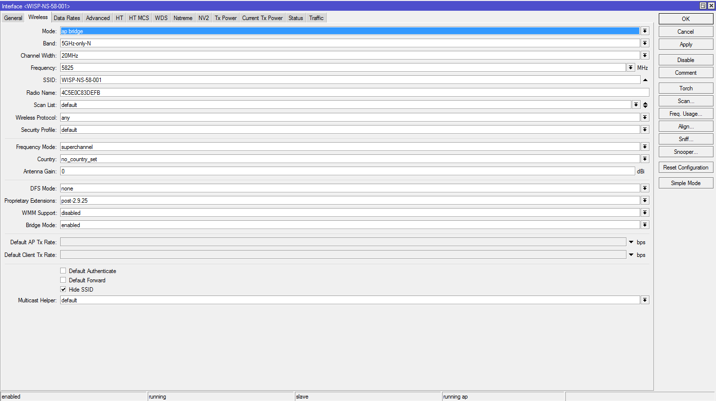 Está usando superchannel na base, mas precisa mesmo? 5820MHz é tão diferente de 5825MHz? Não sei se tem relação com seu problema, mas testa o frequency mode em Manual TX-Power, não devia ter nada a ver mas a única diferença com relação ao que configuro é isso pelo que notei.