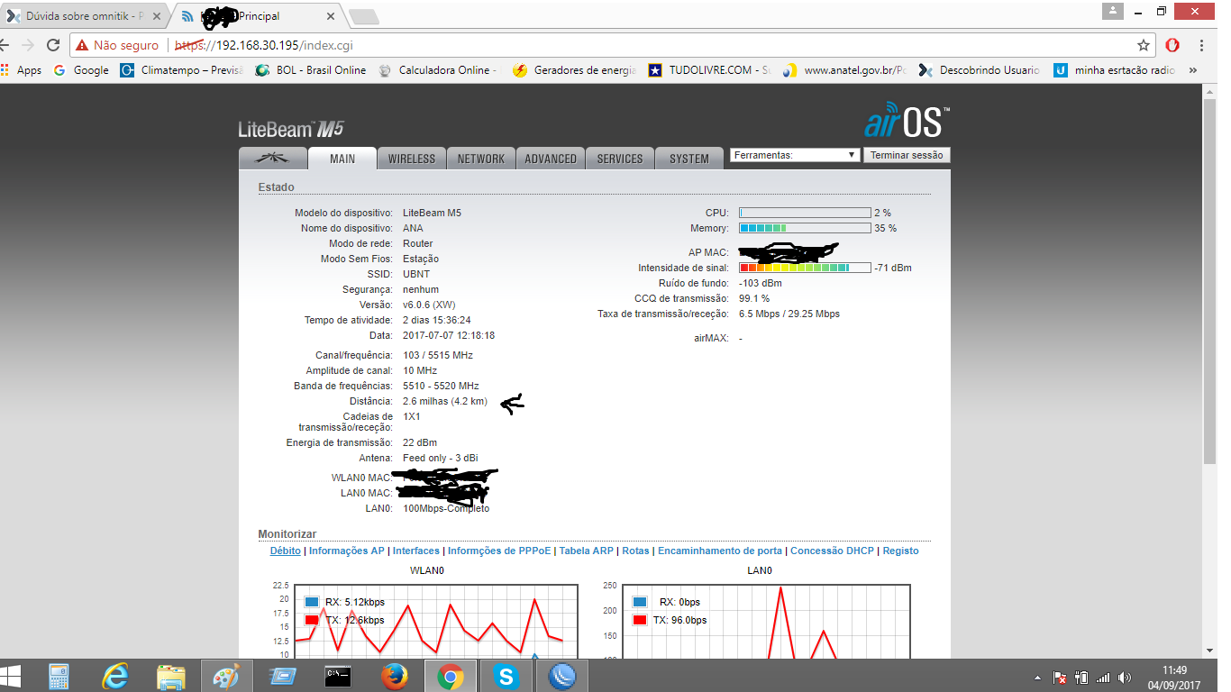 Aqui é interior. Essa omni achou somente o ap q faz ptp até ela. Tá em uma torre de 13m. No lado cliente a litebeam esta a uns 4m de altura do chão. Esse sinal tava melhor. Mas teve uns ventos fortes por aqui. Eu ñ aperto muito aquele treco da litebeam pq parece frágil, Tenho medo que quebre.no airlink da fresnel limpo com 1 metrô de cada lado. Ambos ficam em morros. Vou testar em canais diferentes. Mas esse foi o qlevantou melhor sinal. Reparei q melhora sinal mas cai a taxa. Quando instalei logava com 18Mb 32mb. Ativando Chain 1 da uma diferença de 20 dBm entre tx rx por isso desativei. Tem uma árvore ao lado da litebeam mas como esta a uns 90 graus ao lado quase impossível q esteja causando isso. Tou pensando em comprar uma omni de 12dbi e tentar mudar um Chain. Sei q é gambiarra. Mas tenho algumas bem funcional. Estranho q funcionou por alguns dias perfeito. Ao do nada parou. Ppoe conectado. Mostra q tem Internet pega IP dns gat mas ñ navega. Se coloca IP fica perfeito. Mas ai ñ controlo a banda