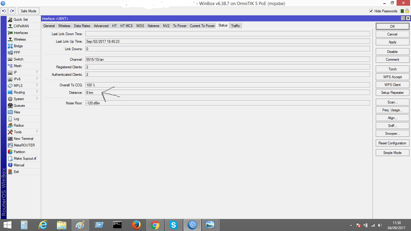 Boas pessoal. tenho uma omnitik pra atender 6 vizinhos, so q tentei por um mais distante com sinal -70 ele conectou pegou ppoe q autentica em outra rb, mas ñ navega, mostra conexão no not, ping da timeout direto, la de vez passa alguns k de trafego, isso ta me enlouquecendo.