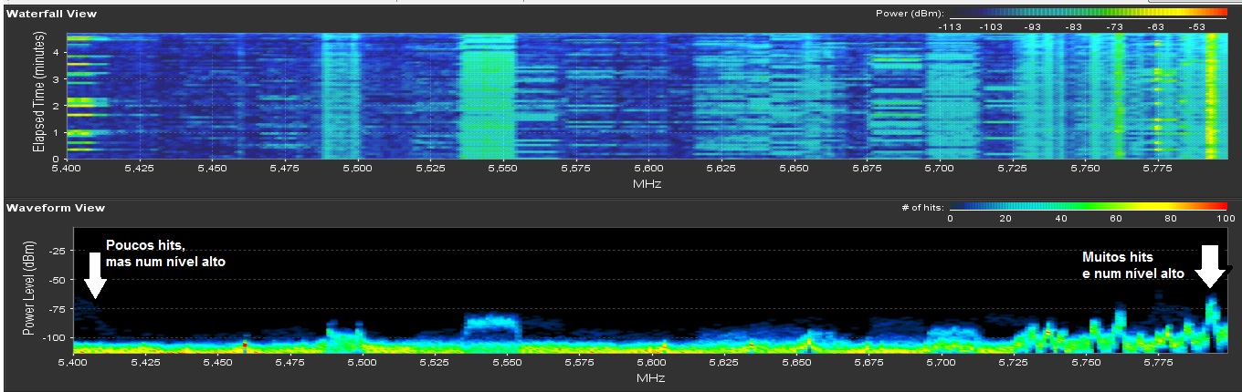 Aqui um exemplo, 2 extremos, o scan de SSID vai mostrar os 2 canais com SSID na casa dos -60dBm, mas... em 5400MHz aparentemente é um cliente, tem dados esparsos, no waterfall view tem rajadas amarelas, mas isso é nível de sinal, se for uma rajada a -60dBm por MINUTO atrapalha pouco, pra isso ele mostra em baixo o numero de hits, que é bem baixo, aparentemente são MENOS de 20 hits em 5 minutos! Isso não é nem o ping do Windows verificando se tem internet, isso é realmente só a CPE trocando dados com o AP pra verificar status: