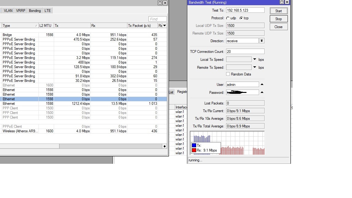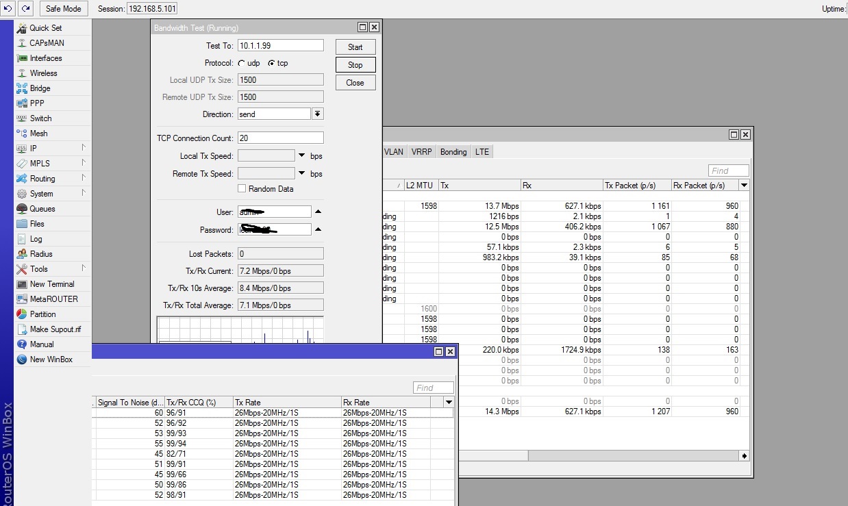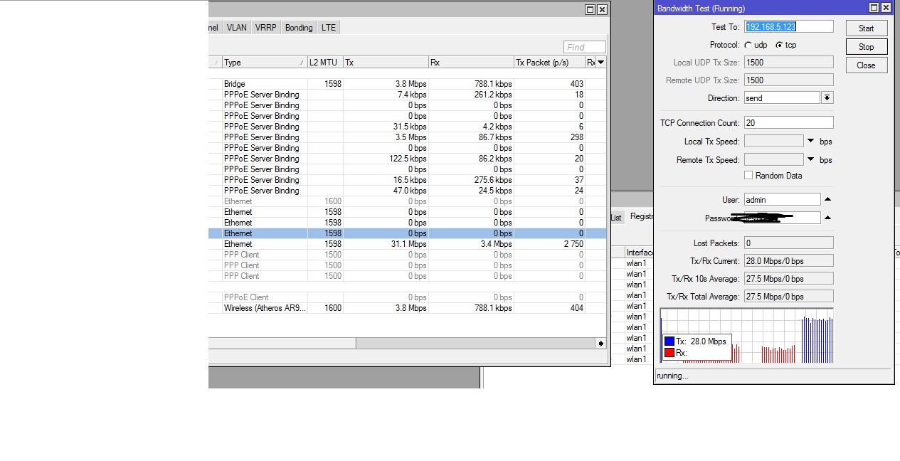 O teste foi efetuado para um cliente ppoe ilimitado conectado por wifi, mas para matar de vez a questão da porta lan fiz o seguinte agora, mandei um bandwitch teste para o sxt que recebe no ponto a ponto aqui em casa, então ela usou a lan para mandar, passou 25 mb pois estou em mcs 4, o máximo, então a porta lan esta tráfegando dados normalmente, da pra ficar louco.