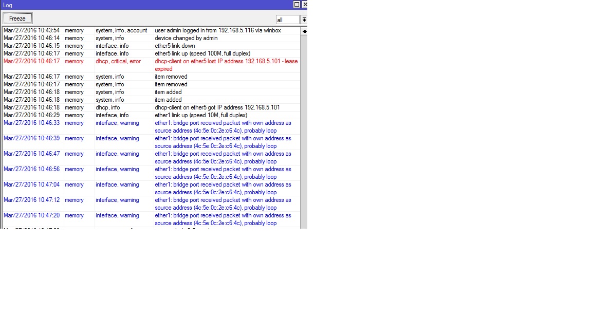 Mais uma prova de que a porta ether 1 mesmo desligada esta influenciando em outras, vejam na imagem o log, todas portas estavam disable menos a Ether 5, loguei habilitei a Ether1 ela derruba a ether 5 em seguida a conexão e restaurada, logo em seguida a porta ether 1 assimila uma conexão de 10mb SÓ QUE ELA NÃO ESTA CONECTADA A NADA!! Depois disso a omni fica louca e começa a derrubar os clientes PPPOE,desligo a Ether 1 tudo volta ao normal mas a entrada na porta Ether 5 não passa de 10mb, solução seria apenas a troca da Omni??? Clique na imagem para uma versão maior
