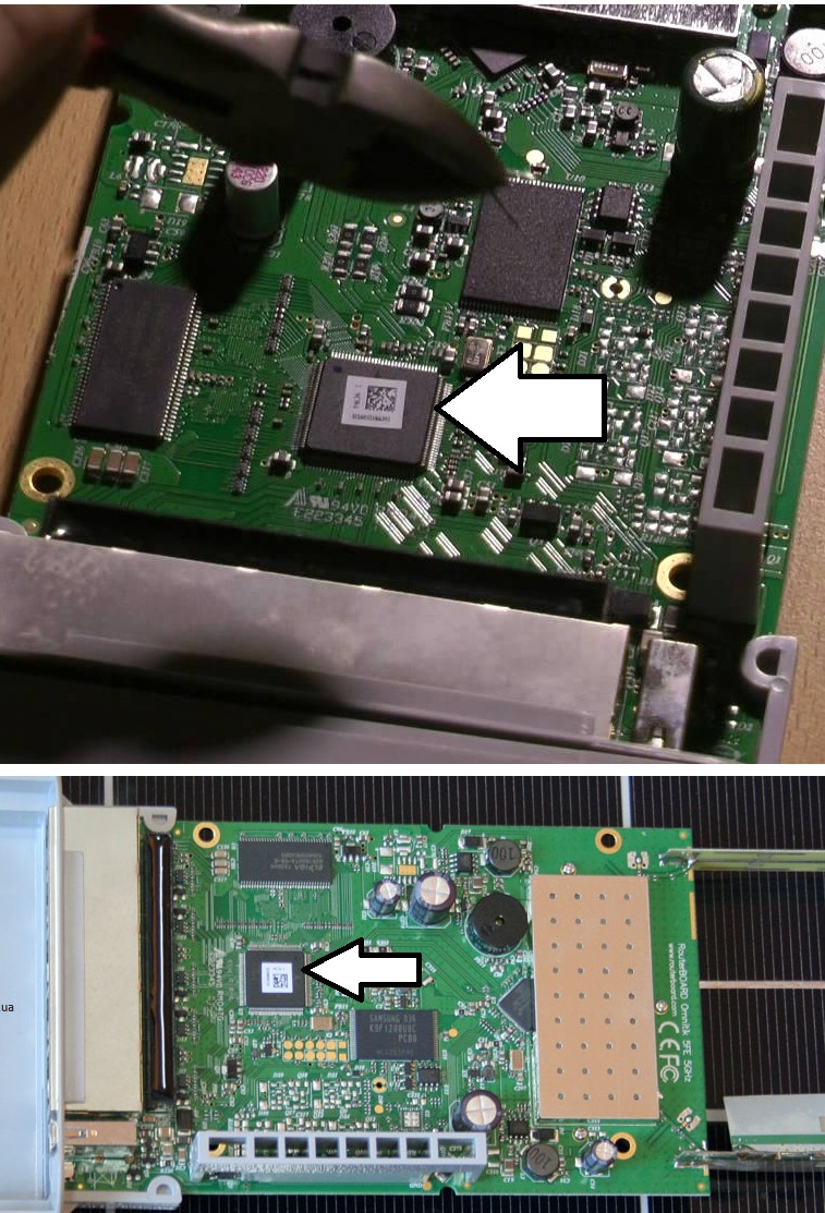 A omnitik com POE talvez seja um pouco diferente por dentro, mas é o chipset Atheros. É o chipset principal. Os outros CI's grandes são a memóra Ram, a memória Rom ou a memória flash, e debaixo da latinha que de blindagem tem o chipset de RF, que controla só a parte de RF, entrada e saída de dados pelas antenas, mas isso também pode ter sido afetado NESSE CASO porque as portas ethernet vão direto pro chipset principal. Se fosse RB com um switch, o switch poderia queimar (Ou mesmo ser removido!) que a parte de RF continuaria. É tipo uma placa-mãe ATX, você pode colocar 2 placas de rede ethernet e 2 placas wifi, se as placas ethernet queimarem o resto do PC, incluindo a parte de wifi, continuam funcionando. Só que a Omnitik tem tudo integrado, a placa de rede é soldada no processador, se queima a rede tem que trocar o processador.