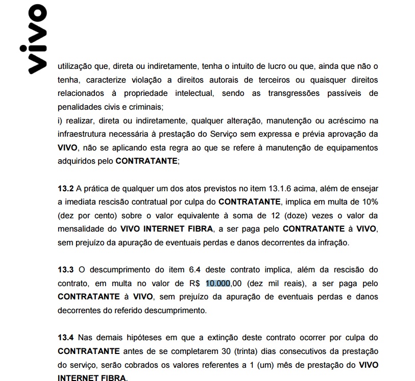 13.3 O descumprimento do item 6.4 deste contrato implica, além da rescisão docontrato, em multa no valor de R$ 10.000,00 (dez mil reais), a ser paga peloCONTRATANTE à VIVO, sem prejuízo da apuração de eventuais perdas e danosdecorrentes do referido descumprimento.