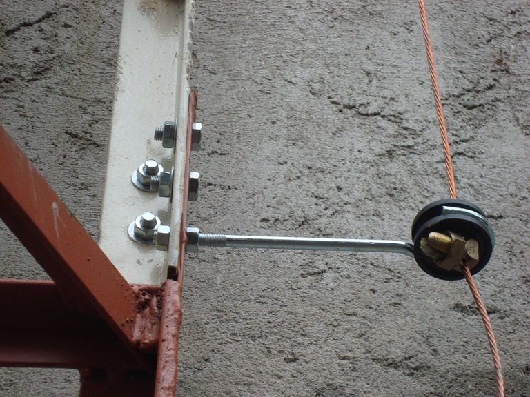 O cabo de aço desce fora da estrutura metálica ancorada por olhal e a distância de uns 10 cms aparafusada da estrutura metálica com isolação em cada módulo da torre. Por dentro isto fere a norma de aterramento fiz vários projetos em autocad, mas parei de 2014 para cá, tem norma sim, mas agora nem me lembro mais terei que averiguar nos desenhos em autocad de cada uma das torres já projetadas.