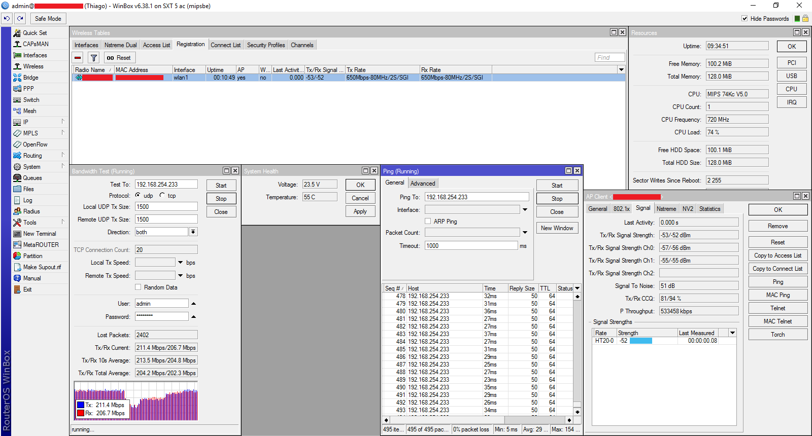 Esse sinal de -57dBm não é suficiente pra AC, por isso o RouterOS NÃO ESTÁ USANDO AC! Veja em www.mcsindex.com que 650Mbps vem a ser uma modulação de N, é MCS15 a 80MHz (MCS7 em dualchain vem a ser 100% a mesma coisa que MCS15 em N). Naturalmente baixando o data rate, o throughput real (O pass throughput é o presumido pelo número de cabeçalhos, ele leva em conta o percentual legível dos pacotes, ele não confere com o throughput real porque os dados do usuário ficam DENTRO de um pacote wifi que adiciona cabeçalhos e sincronizações diversas. Mal comparando: o throughput real é sua encomenda dentro de uma caixa dos Correios, a caixa dos Correios dentro de um caminhão é o pass throughput, e o caminhão inteiro é o data rate))