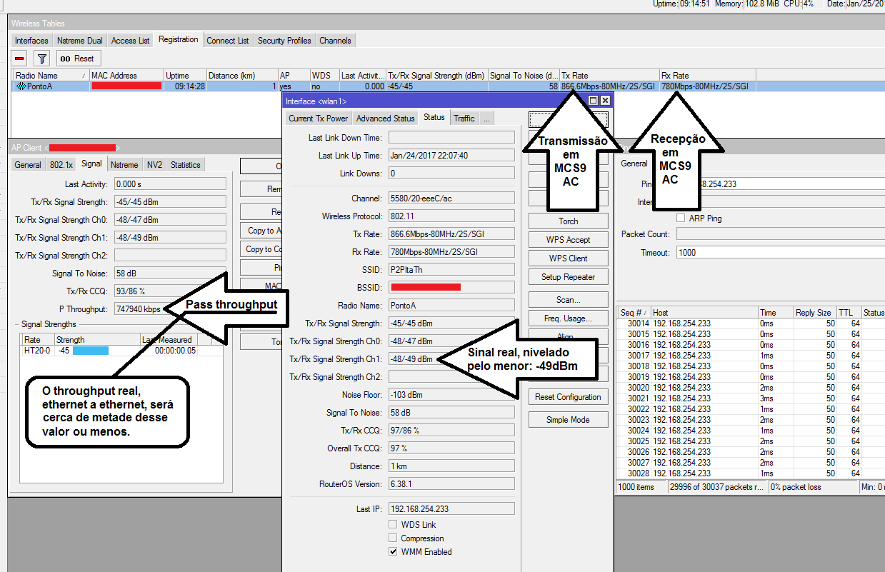 Tem que se basear pelo menos sinal presente. Nesse caso é -49dBm. Como é uma margem suficiente, o sistema RouterOS está usando de fato AC, está usando MCS9.