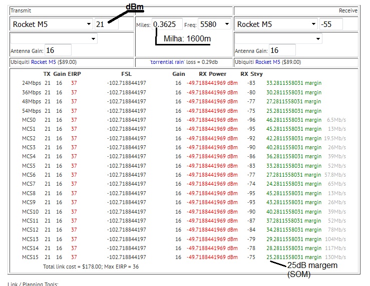 (No caso do Rocket AC e de umas RB's AC, cuida que eles tem só coisa tipo 19dBm nos datarates mais altos, pra esse caso precisa compensar isso com ainda mais antena, se a potência cai 3dBm é só colocar antena 3dBi maior, o que importa é a potência EIRP (dBm do rádio + dBi da antena) na hora de calcular)