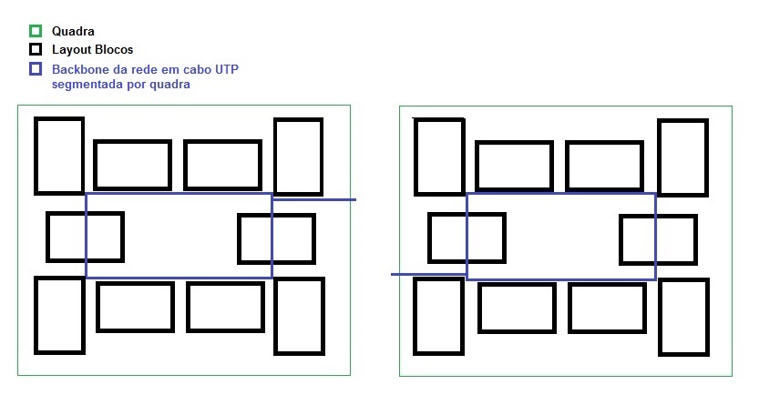 Pensei em fazer um BackBone(desculpe caso não seja o termo correto) da rede por quadra, os cabos sendo passados por baixo do beiral dos kalhetões fazendo um retângulo passando por todos os dez blocos, cada bloco possui ponto de energia disponível, em cada bloco vai um switch de 8 portas, e conforme a demanda substituo por um switch de 16 portas. Dessa forma preciso de 250 metros em média de cabo UTP por quadra.