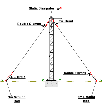 (Ah, isso de aterrar estaio foi o que fiz em toda torre que eu mesmo montei, 2 ou 3 hastes ligadas em cada estaio e pronto. Fiz isso porque numa fazenda um arame liso de estaio (Nesses locais pessoal sempre preferia isso ao invés de cordoalha, pra torre baixa de 30m sempre foi ok) foi cortado por um raio. E a teoria que vemos os raios seguirem no dia-a-dia é a do menor esforço, ele não vai pular pra estrutura pintada se tem um condutor aterrado com caminho livre!)