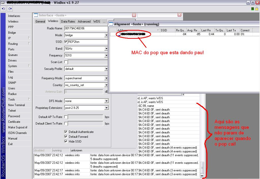 A placa original era uma AG530 em 2.4.. troquei pela G520 e permaneceu o erro. Troquei a antena, pq de tarde o sinal sempre ficava fraco, e permaneceu o erro... Agora há pouco troquei tudo, mother, processador... só mantiva uma AG530 q faz o backbone em 5.8 e o compact flash que tinha o mikrotik. Até o momento resolveu, vou seguir acompanhando...