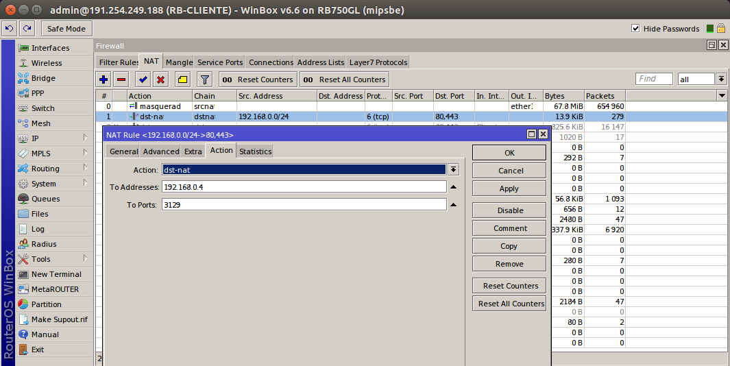 Na RB em to adressees 192.168.0.4 e to Ports 3129