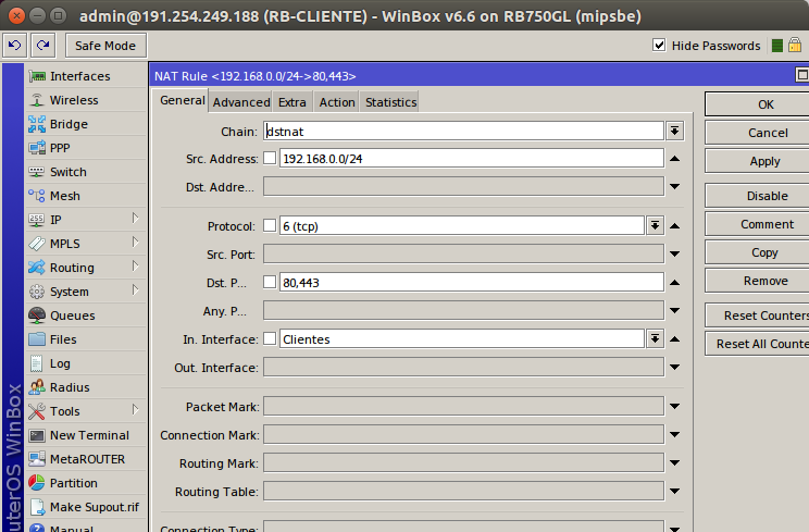 Não tenho nenhuma regra de firewall no Linux e na RB.