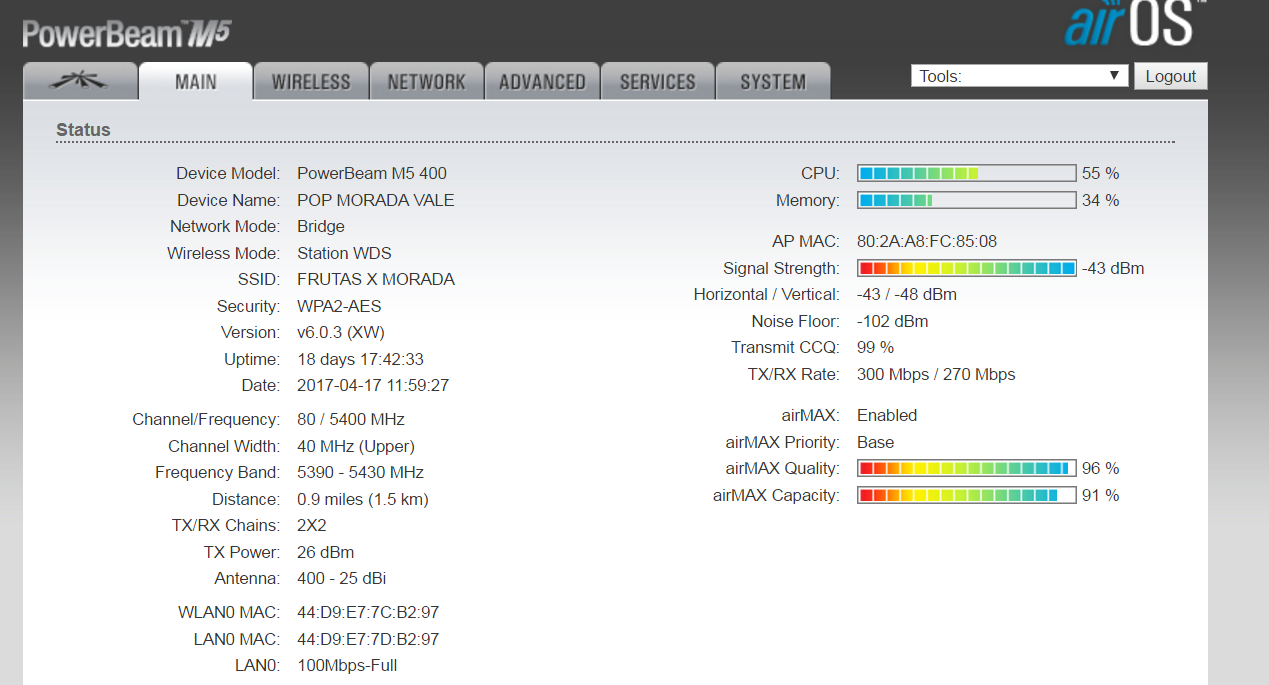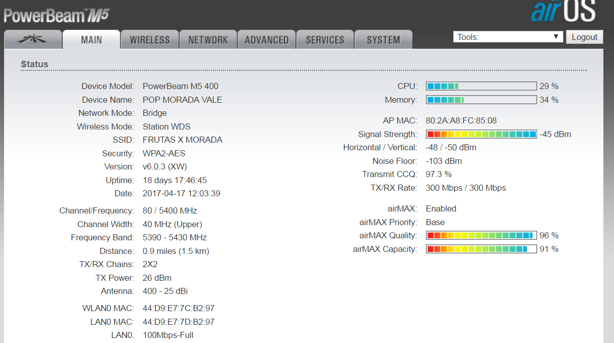 Postado originalmente por STARNETVALE Radinho de $400 cruzero.... Powerbeam m5 400 A questão não é o radio e sim "quem" o configura x alinha ! Segue anexo a foto... Obs: 100Mbps Half não é full, full duplex não passa mesmo...... Anexo 66776 As barrinhas ficam 100% qualidade e capacidade e que no momento desse PRINT esta transitando 51 mbps down