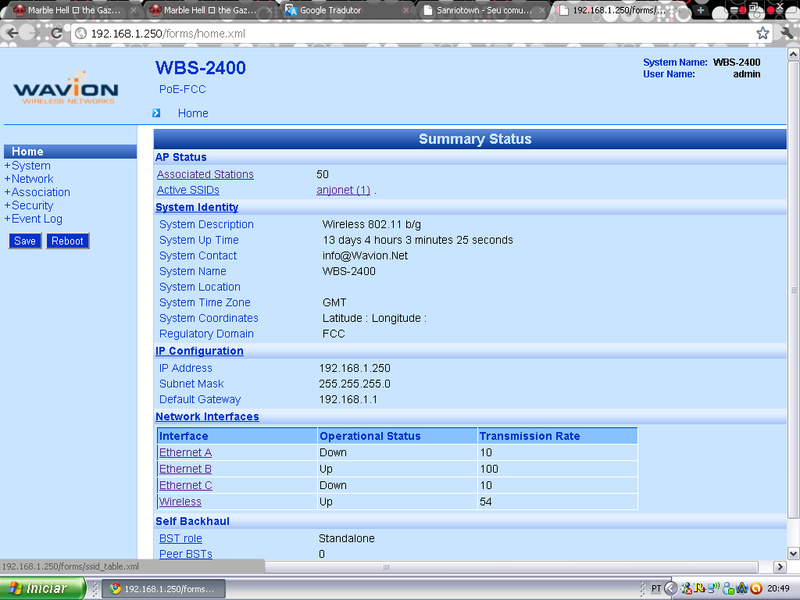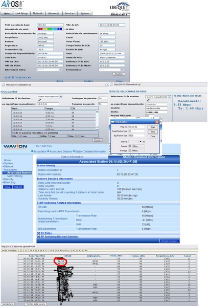 Venho reportar a comunidade a experiência que tive como wavion sector 2.4. Quando coloquei na torre e começei a testar bateu arrependimento, scaneava e não achava nada, quando achava sinal éra péssimo, mal conectava. Más depois de uma noite mal dormida o muleke surpreendeu, o firmware é diferente pra caramba, muita coisa que não dá pra entender, mais pouca coisa pra se mecher. Nos testes usei um bullet 2.4 com aquario de 25dbi a 1.1km da torre. Vou anexar alguns prints pro pessoal avaliar. Para se ter uma idéia melhor de estabilidade e quantidade de clientes vai demorar um pouco pois a torre é nova e os clientes serão cadastrados gradativamente.