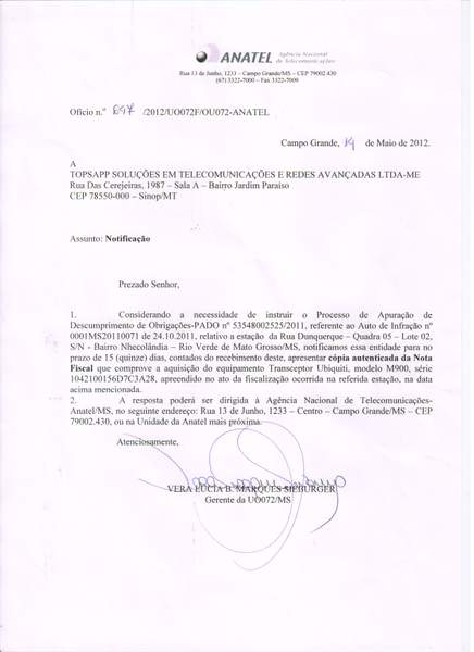"Oportunamente, relata-se que o aparelho em objeto da autuação foi utilizado em caráter de “teste” em período anterior ao da data da visita dos agentes, o qual era utilizado em um ponto-a-ponto sem fins comerciais com um link de internet de 800kbps somente para testes, ao qual no momento da notificação encontrava-se ligado mas não estava mais sendo utilizado para este fim ou qualquer outro devido o fim dos testes."