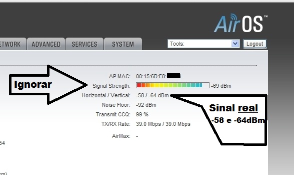 Mas não se engane com sinal exibido, o "signal strength" geralmente é o sinal do preambulo, que é feito no menor datarate, o sinal REAL é exibido separado e é sempre mais baixo.