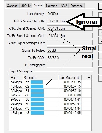 Em MK fica mais claro, ele mostra o sinal por datarate, dá pra ver que o sinal exibido é na verdade no menor datarate, e o sinal real é o do datarate em uso no momento, nesse caso tem uma diferença gigante de 6dBm (Suficiente pra mudar um CCQ de 80% pra 100%):