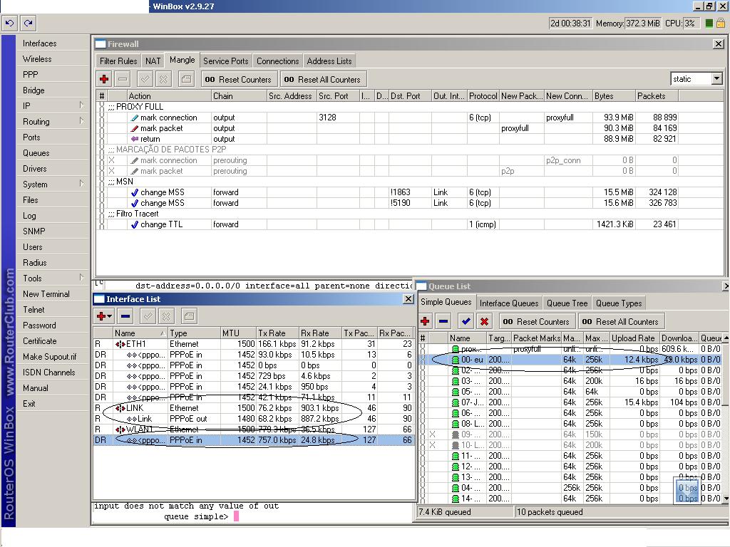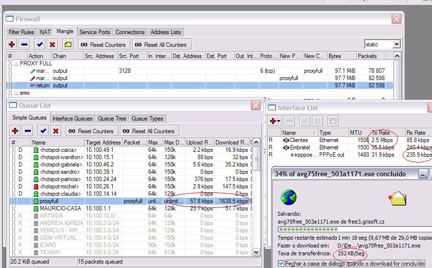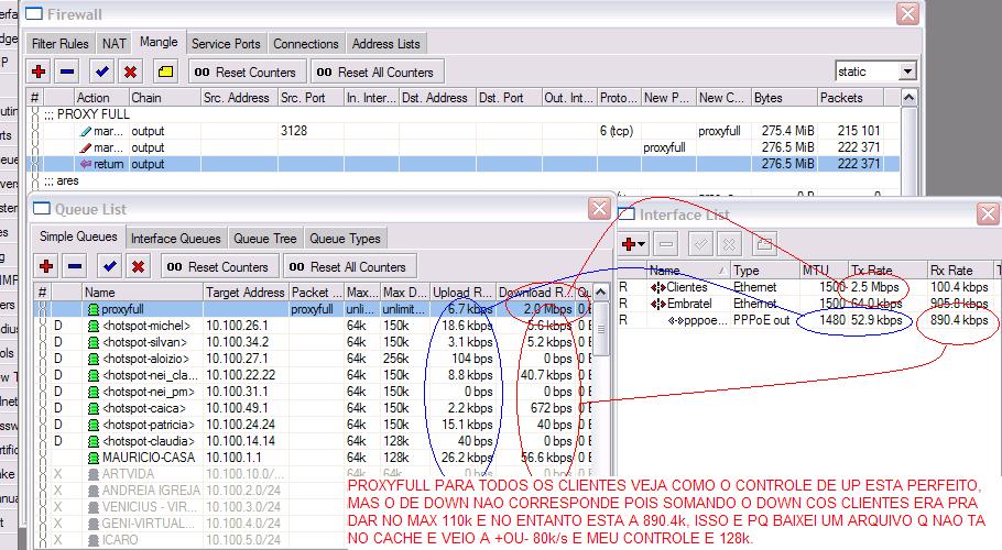 no momento dos teste coloquei meu ip fixo no queues e acredito q a taxa que mostra la de up e down seja proviniente do winbox.