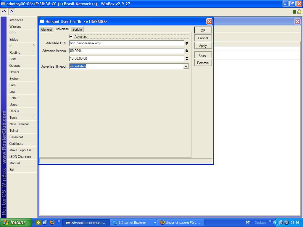 Apos logado, para que o cliente seja redirecionado para uma site fora do Mikrotik, basta especificar o endereço do mesmo em Advertise URL.