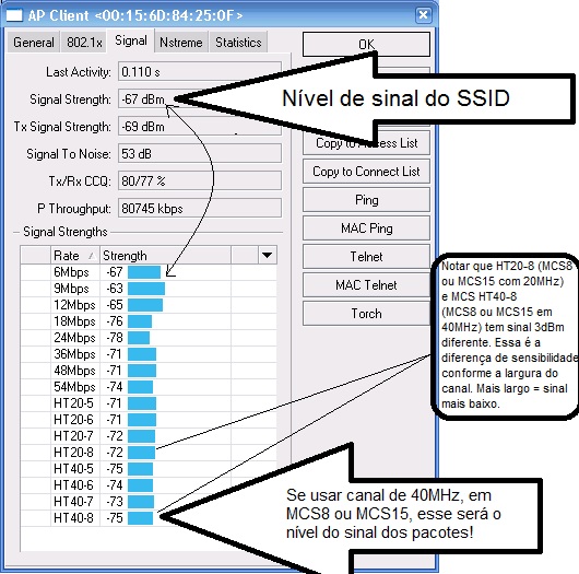 Aquela exibição de detalhes de conexão em Mikrotik é educativa pra caramba! Ela mostra como o sinal do SSID está sempre acima do sinal real dos pacotes: