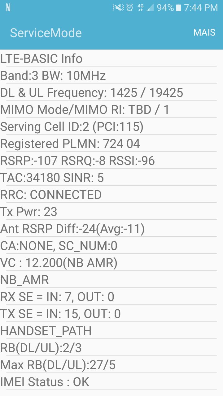 Na 1ª linha do print podemos verificar que a rede é 4G (LTE), operado em um rádio MIMO (4ª linha).