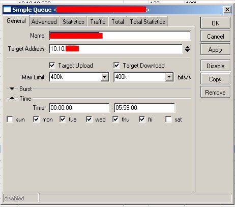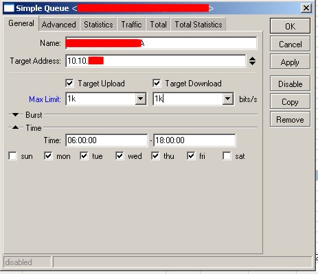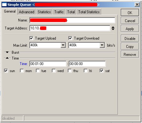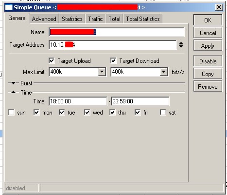 Aja script hein... ai vc vai precisar se for usar a opção do amigo acima, vc tera q criar por usuario mais uma regra liberando aos sabados e domingos... mas vem ka... vc sabe que existem clientes q nao conseguir conectar, fuçam em tudo, e gerando depois atendimento a ele, e xateação pq sempre é problema nosso pq nao funciona internet, nunca é o cliente q desativo uma placa, ta colocando senha errada, nao digita certo o end. da pagina, sendo assim, pq vc nao cria controle de banda... limitando o acesso por ex. de dia.. e deixando o trafico funcionar depois das 6 e aos sabados e domingos. Veja os anexo q mandei como modelo, vc pode tbm dessa forma aumentar a banda do usuario em determinado horario. assim o cliente nao mexe em nada pq conecta.