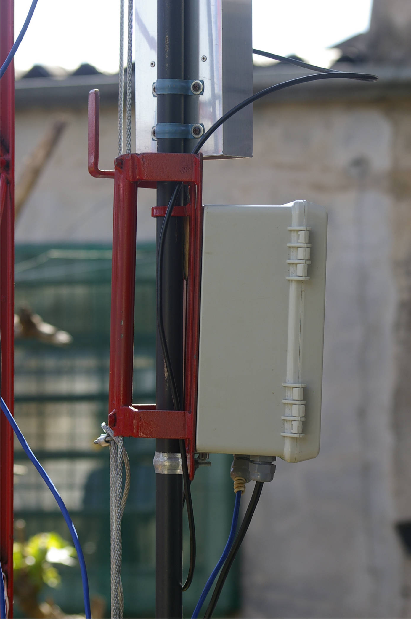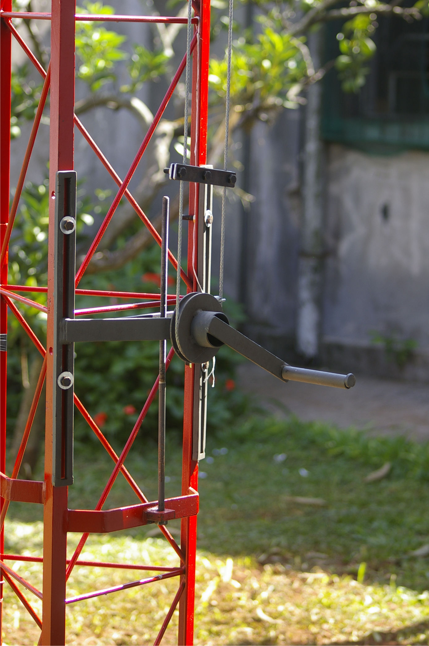 Na primeira foto da para ver o sistema antes de encaixar. A peça vermelha que fixa a caixa hermética e a antena, tem uma haste que se encaixa no suporte da roldana superior, fazendo que todo o sistema fique na posição correta sem balançar.
