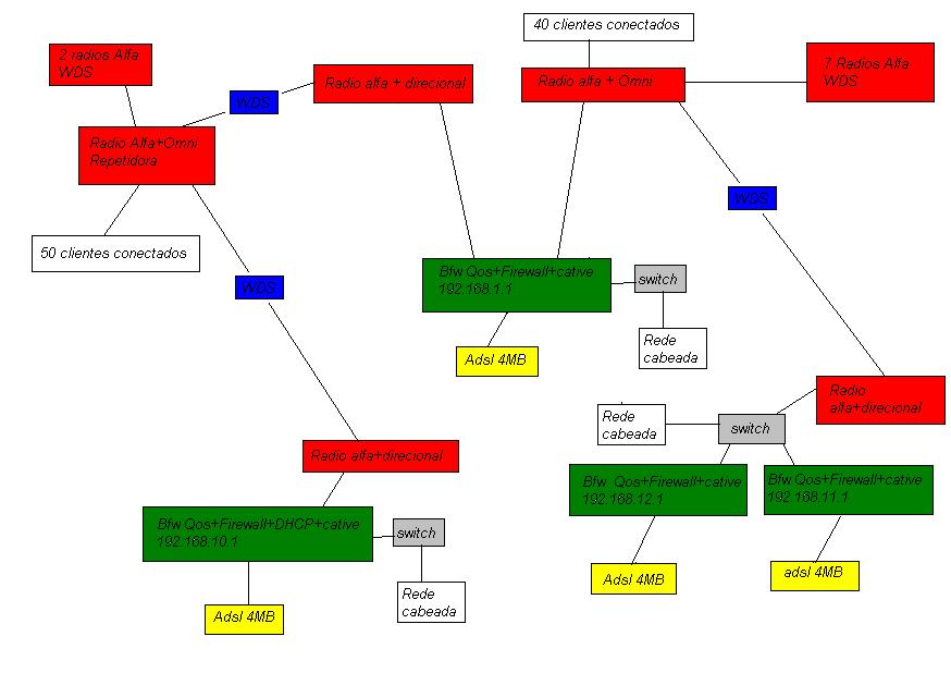 Os outros 9 radios alfa ficam espalhados como pequenas repetidoras ligadas em bridge do bfw via WDS dos radios principais. atendendo clientes que moram perto um dos outros, cabeados ou WIFI.