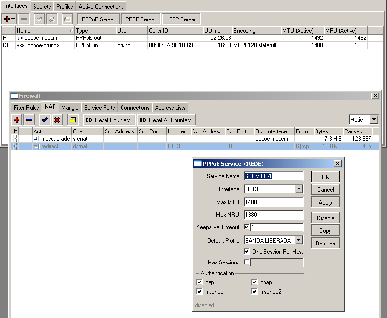 fiz um nat , e criei o pppoe server, funciona normal.. mais é aquele negocio, se não conecta a net funciona do mesmo jeito!