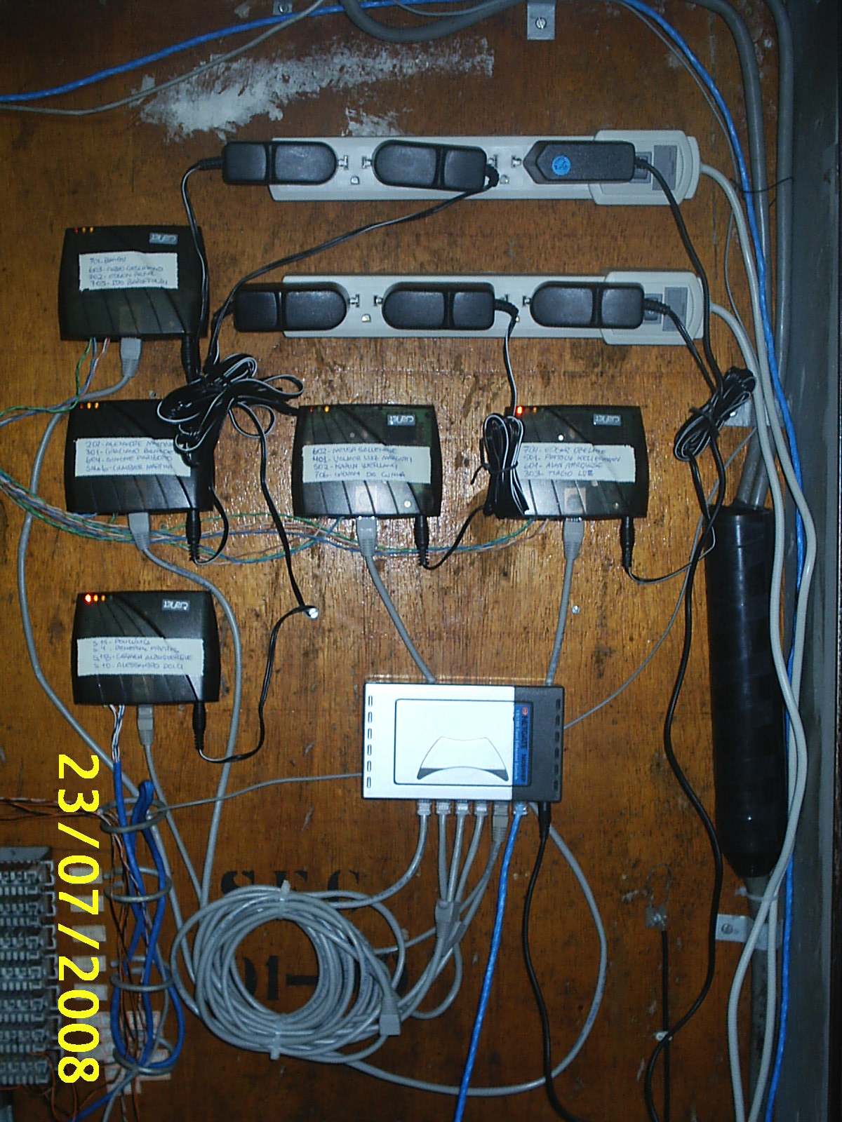 Do nada os clientes "travam", ficam sem resposta. Até no meu apto, que fica no segundo andar (pouco cabo) acontecia, o que foi amenizado quando troquei esse switch ethernet da foto por um switch gerenciável, criando uma VLAN entre cada HUB hpna e a porta da WAN do switch gerenciável, onde chega a internet. Outros casos críticos, é a perda de pacotes entre os clientes o e gateway, sendo que fisicamente estão no mesmo prédio.