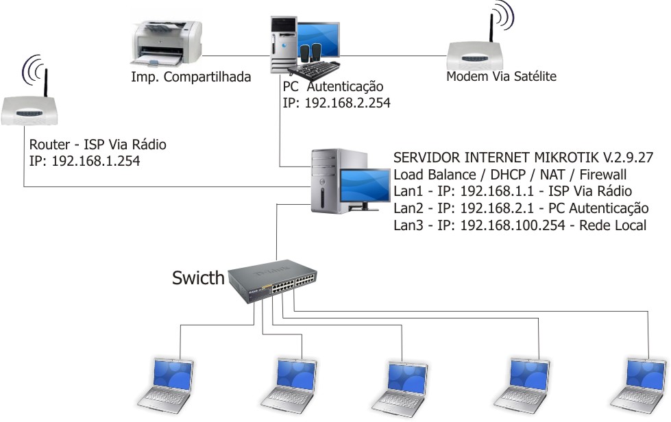 Meu problema: Este PC que faz a autenticação da conexão via satélite, tem uma impressora compartilhada, onde todos os PC`s da rede o utilizavam para fazer impressão, antes de ser implantado o server MK para LB. Agora como este PC esta 'antes' do MK, ele não esta aparecendo na rede e conseguinte a impressora tb não.