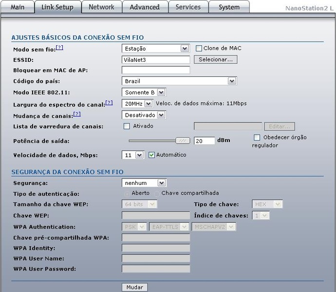 É apenas um cliente nesse rádio. Ele está em bridge. Não uso criptografia, somente controle por hotspot e ip x mac.
