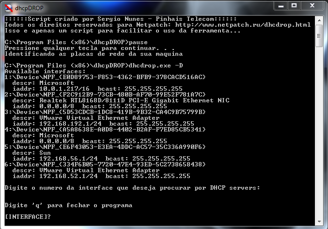 Observe na imagem acima que automaticamente o programa já listou suas interfaces de rede. No meu caso são muitas porque tenho máquina virtual instalada. Basta você identificar qual é a placa de rede que você quer scannear por DHCP servers e informar ao programa através do número da placa. Ele fará uma varredura e informará se existe ou não um servidor na sua rede. Cuidado, não vá dropar seu próprio servidor.