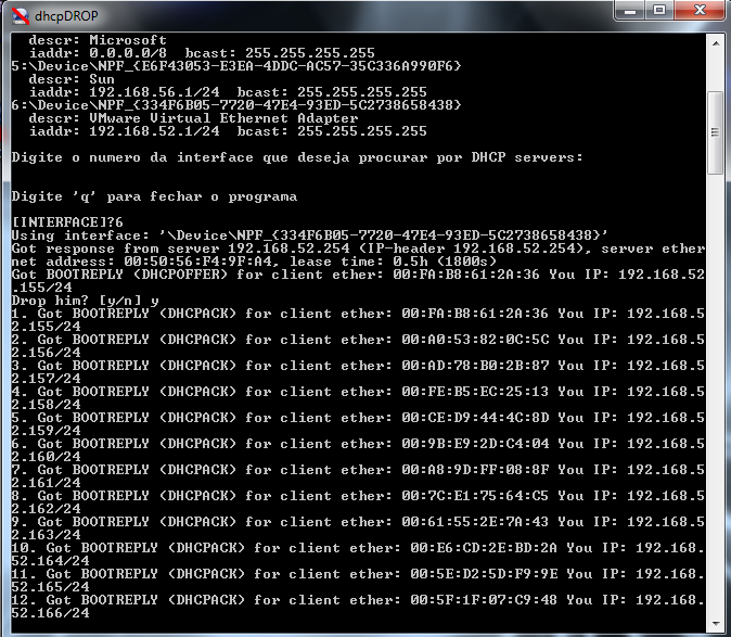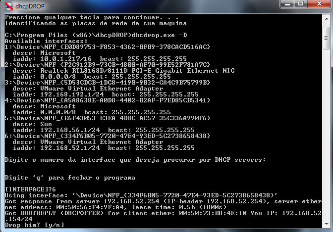 Agora na imagem acima o programa identificou o MAC Adress e o IP do DHCP server na minha rede e me perguntou se eu desejo 'dropá-lo'. Vou dar y (yes)