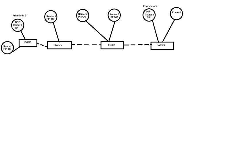 Estou com a seguinte dificuldade na migração de minha rede para o OSPF. Em, anexo segue imagem de como está a minha topologia atualmente, se analisarem, praticamente todos os meus roteadores formam borda, e devido a isso criei uma unica area (Area 0). Nela possuo 2 roteadores BGP em localidades diferentes, na qual setei um deles com prioridade 3 e outro com prioridade 2, para que se denominem DR e BDR. Até ai tudo bem, o OSPF fechou, gerou as rotas, tudo ok. PEdi para os 2 BGPs, gerarem as rotas default e geraram tambem...