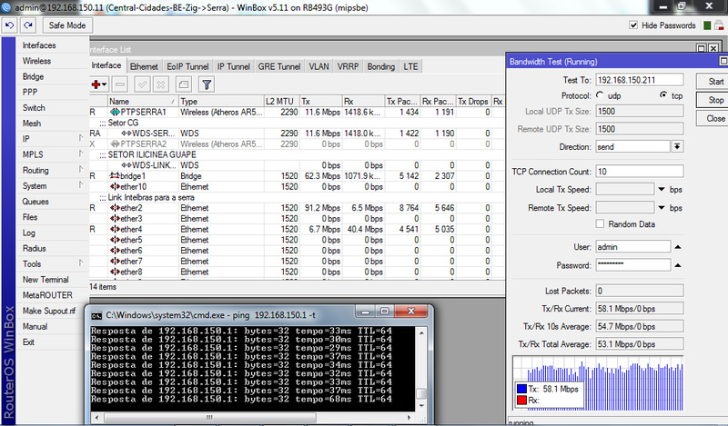 Bom dia a todos, ontem fechei um enlace na empresa ZIG NET DIGITAL, localizada em boa esperança, MG, onde o provedor encontrava-se saturado em um de seus links, entre duas cidades, conseguindo no Maximo 30MB de download, em conversa com o gerente de rede da empresa , apresentei nosso matador, o APC-5M, onde fechei o enlace a uma distancia de aproximadamente de 17km, precisávamos priorizar o download, visto que nesse enlace era para usuários, não necessitando totalmente de um link full, onde conseguimos praticamente 92MB de down, onde verificamos que a performance ficou acima de todos equipamentos testados, onde nossos concorrentes como mikrotik com cartões N, e ubiquiti, não deram conta de passar mais que 30 a 40 MB, assim o APC-5M superou todas as expectativas, em testes realizados full, conseguimos passar 91MB de down, e 75MB de up, reparem nas fotos, a latência do ping, na interface lnk intebras serra, reparem que ta passando quase 91MB e mesmo assim com uma latência ótima, segue as fotos.Clique na imagem para uma versão maior