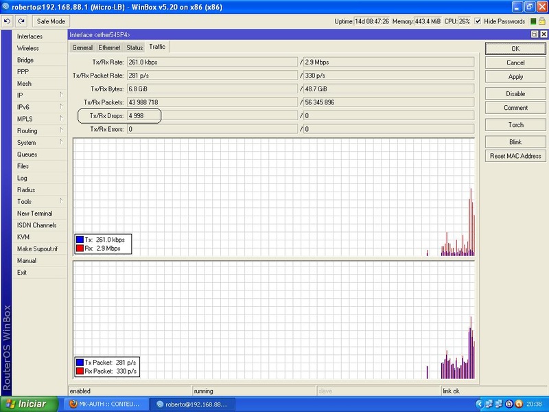 Confira se nesta porta esta com a auto negociação habilitada, se o rate esta em 10 Mbps, 100 Mbps ou 1Gbps.