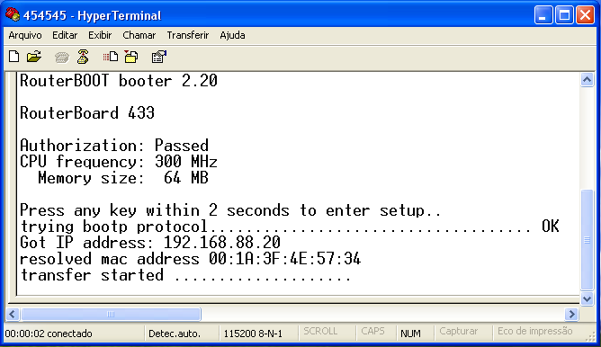 6. Mantendo na RB433L apertado o botão tipo push-button (localizado ao lado dos contatos de reset), ligue a alimentação de energia da RB e aguarde até que o led ao lado do power pare de piscar (entre 10 e 20 segundos) então pode soltar. Neste tempo caso a comunicação com a RB seja estabelecida com sucesso via porta serial, você poderá acompanhar pelo hyperterminal do windows conforme a imagem acima.