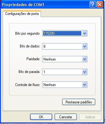 4. Ligue o conector DB9 a porta serial do PC e configure a porta COM de acordo com o que segue: