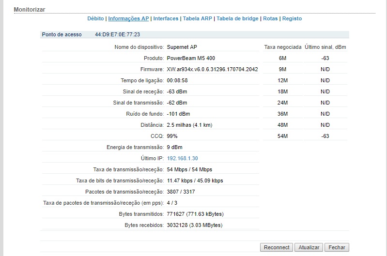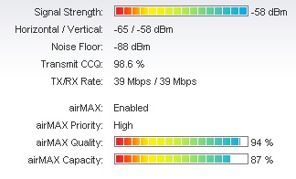 Passando todas as informações corretas, como equipamento para PTP, localização dos pontos, distância, etc. Com isso ele verificará e mostrará informações sobre: Signal Strength, Noise, CCQ, TX/RX, Airmax Quality, Airmax Capacity.