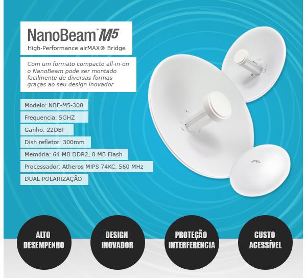 Compacto e funcional rádio a antena são combinadas em um único corpo que ocupa um espaço mínimo.Montagem versátil O NanoBeam pode ser montado em qualquer posição necessária para a linha de visão.Estética o NanoBeam é pequeno o suficiente para se instalar discretamente à localização de um cliente.