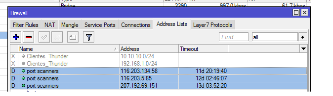 No seu firewall filter, tem uma regra que internet colocam o nome "scan Port." Ela que está incluindo esses Ips na sua lists.