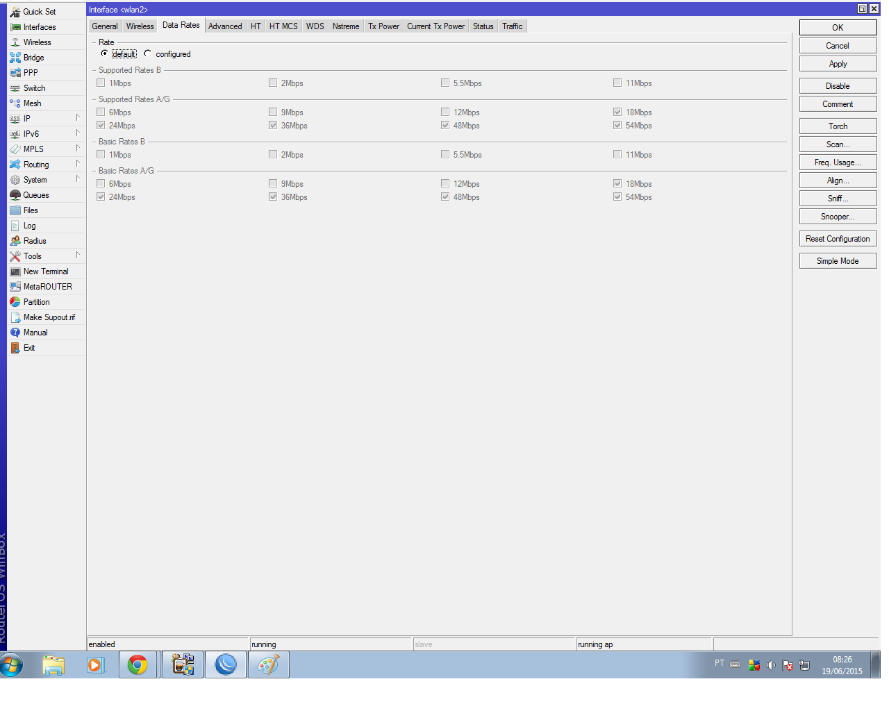 Tem uns errinhos bobos por usar WPA as vezes, mas o perfil de seg. está nomeado como WPA2 então imagino que seja wpa2 (Espero que não seja TKIP, porque isso dá na mesma que WPA, só faz sentido usar WPA2 se for AES/CCN), tem os errinhos bobos em PPPoE se usar na aba WDS ela dinamica (Ou estática?), e tem os errinhos quando fuça no profile de seg. chamado "default" (Dizem... nunca mechi nele então nunca ví problema. O que custa deixar o default lá quieto e criar outro profile? Mas... tem quem altere o default e depois relata problemas), mas isso tudo causa queda de cliente, nada disso cria esse sinal caindo pra -89dbm as vezes, pra acontecer isso precisa problema físico, o R52HN deixando de emitir nalgum dos chains, um pigtail precisando um limpa-contatos, o MK por bobeira emitindo 20dBm a menos por uns segundos (Se caísse de -69 pra -79dBm poderia pensar em amplificador defeituoso, mas cair 30dBm já não é com o amplificador, ele não tem toda essa potencia, o chipset é quem estaria derrubando o sinal se o problema fosse antes do pigtail (Por problema no cartão, na RB (Veja capacitores estufados, RB433 estufa capacitor a cada X anos, leva 5 minutos pra trocar os 4, e custam R$ 1 cada), ou pelo software estar mandando ele fazer isso (Talvez por meter 30dBm na config., obrigando o chipset a operar sempre no limite, com o amplificador também no limite, danificou alguma coisa).