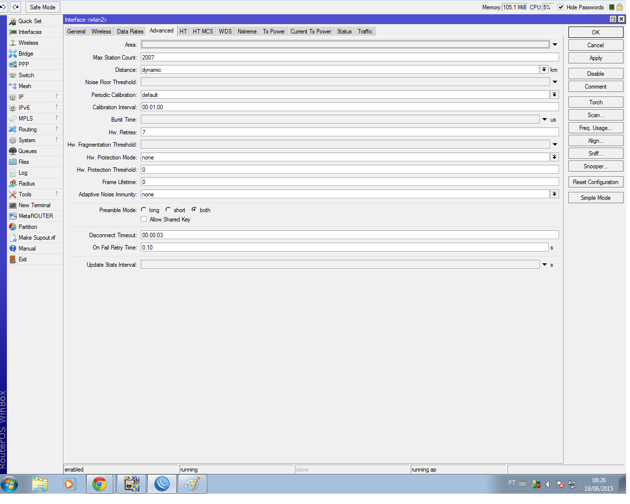 Mas mal não faz aumentar esses timeouts todos, on fail de 0,1 pra 1s, frame lifetime de 0 pra 5, hardware retrie de 7 pra 10, timeout de 3 pra 10s, desabilitar calibration.